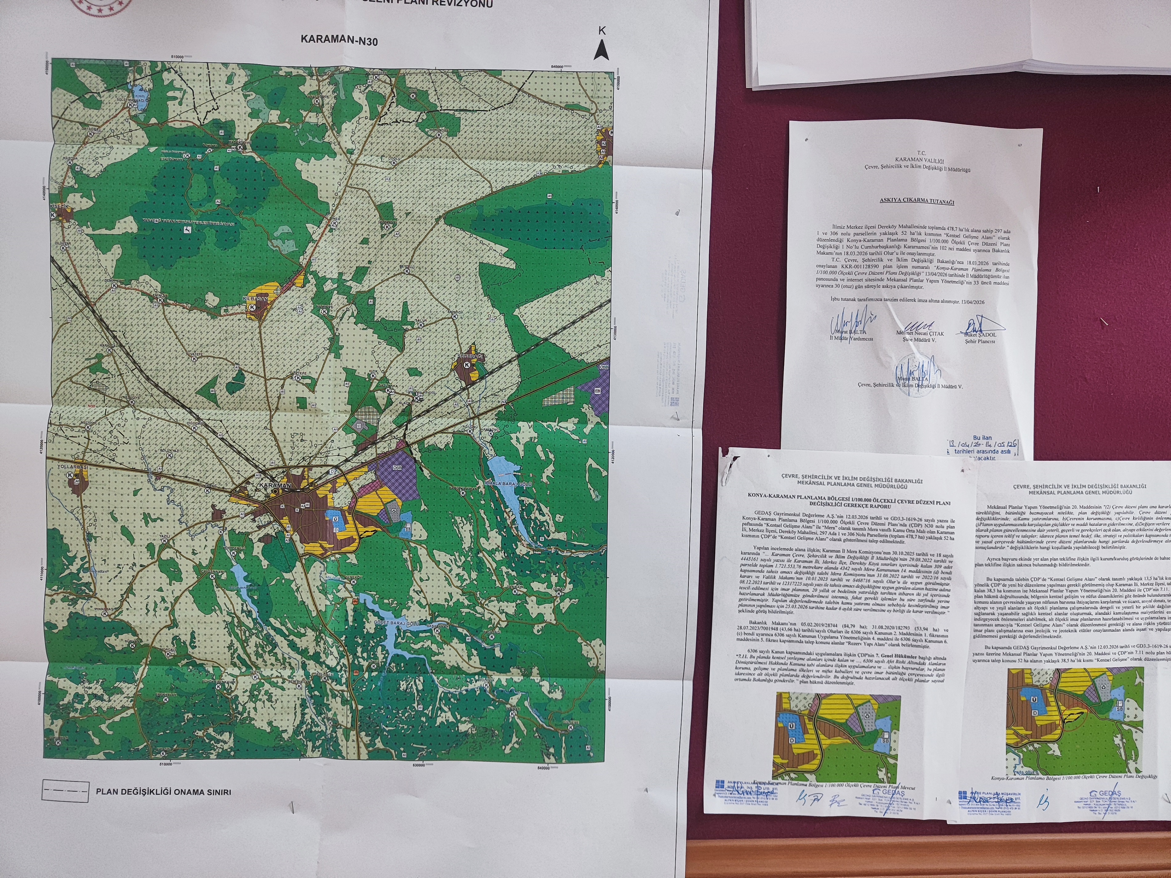 T.C. Çevre, Şehircilik ve İklim Değişikliği Bakanlığı’nca 18.03.2026 tarihinde onaylanan KKR-001128590 plan işlem numaralı “Konya-Karaman Planlama Bölgesi 1/100.000 Ölçekli Çevre Düzeni Planı Değişikliği” 13/04/2026 tarihinde İl Müdürlüğümüz ilan panosunda ve https://karaman.csb.gov.tr/ web adresinde Mekansal Planlar Yapım Yönetmeliği’nin 33 üncü maddesi uyarınca 30 (otuz) gün süreyle askıya çıkarılmıştır.